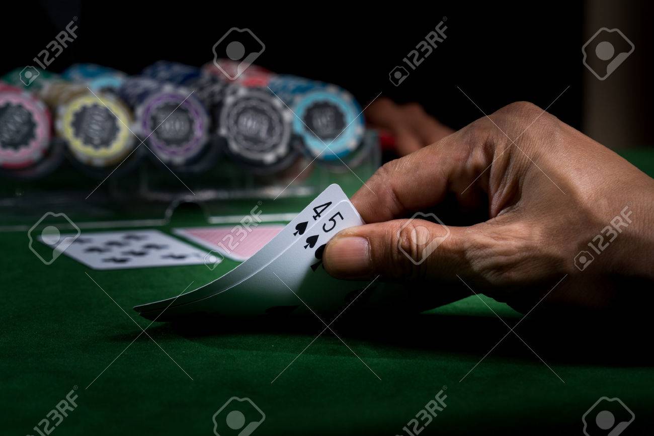 A Hand Holding The Cards Show Face Values Nine To Win A Blackjack Game On Green Table And Blurry Stacked Chips Background In The Casino Stock Photo Picture And Royalty Free Image